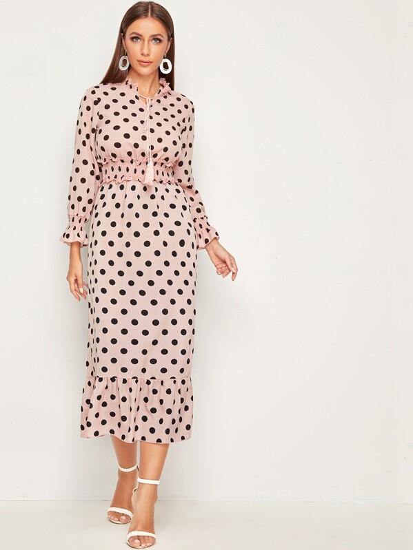 Polka Dot Shirred Tassel Detail Frill Trim Dress
