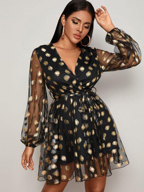 Polka Dot Surplice Front Belted Mesh Dress - $17.00 SGD