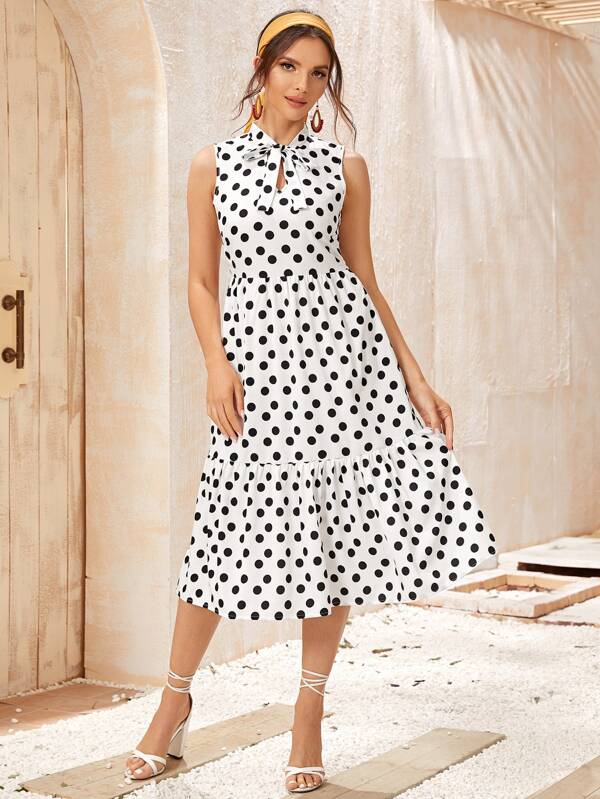 Polka Dot Tie Neck A-line Dress - $21.00 SGD