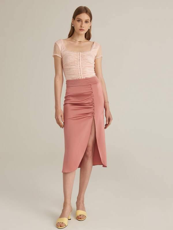 Premium Ruched Waistband Buttoned Front Split Thigh Skirt