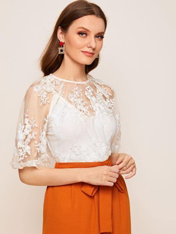 Puff Sleeve Floral Embroidered Mesh Sheer Top Without Camisole