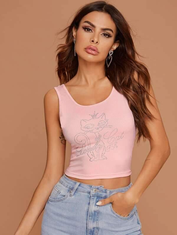 Rhinestone Rib-knit Tank Top - $16.00 SGD
