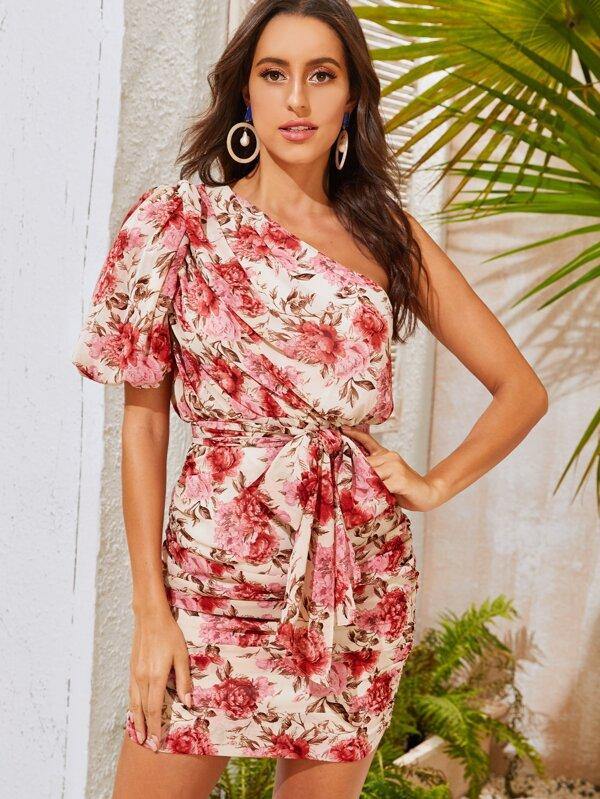 Ruched Detail One Shoulder Puff Sleeve Self Belted Dress