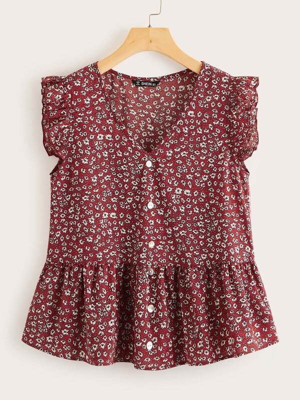 Ruffle Armhole Ditsy Floral Peplum Top - $30.00 SGD