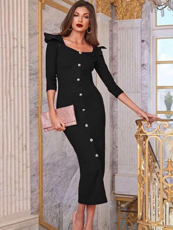Ruffle Trim Buttoned Front Split Back Dress - $26.00 SGD