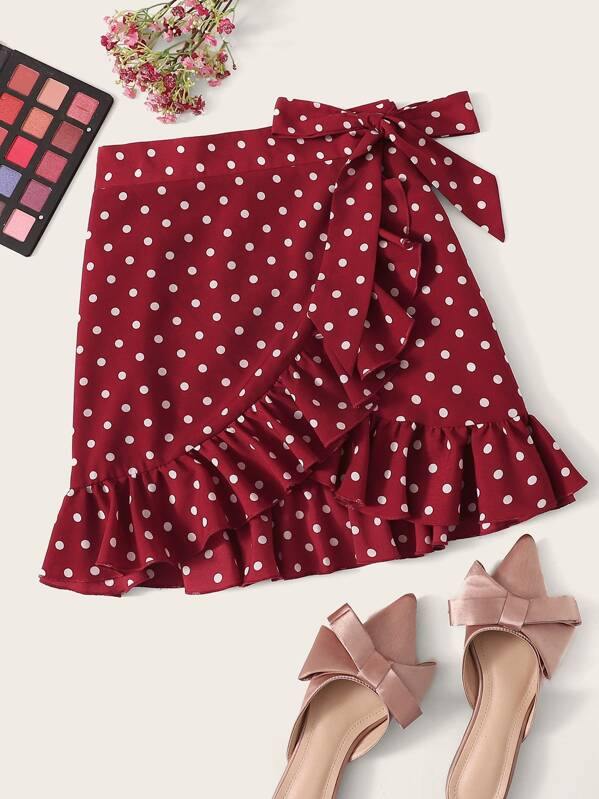 Ruffle Trim Knot Side Wrap Polka Dot Skirt - $21.00 SGD