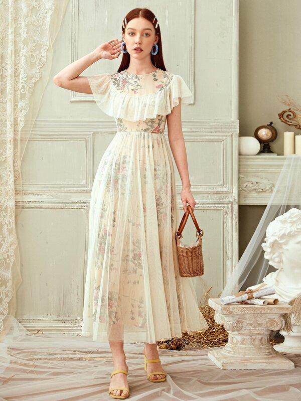 Ruffle Trim Mesh Overlay Floral Print Dress