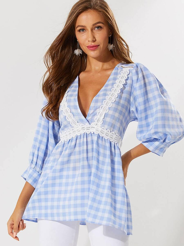 SBetro Gingham Lace Insert Plunge Neck Top - $34.00 SGD