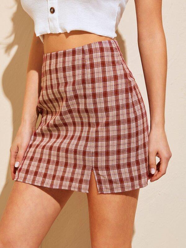 Slit Hem Plaid Skirt