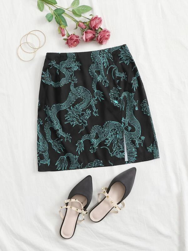 Split Hem Dragon Print Skirt - $16.00 SGD