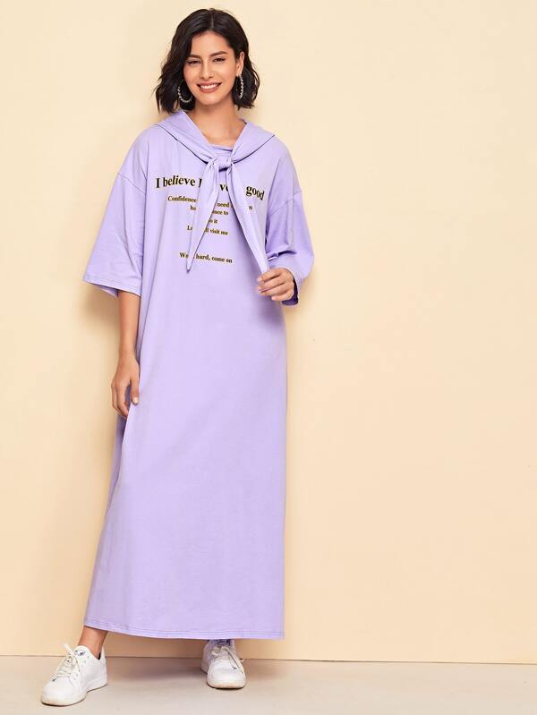 Tie Front Slogan Graphic Hooded Dress - $22.00 SGD