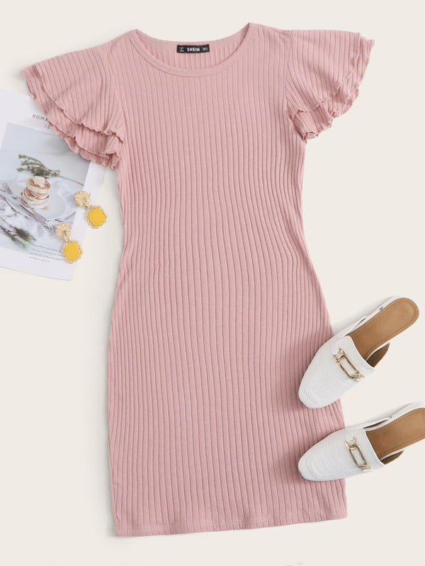 Two Layer Ruffle Sleeve Rib-knit Dress