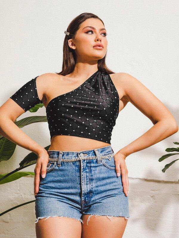 Asymmetrical Neck Glitter Grid Top - $29.00 SGD