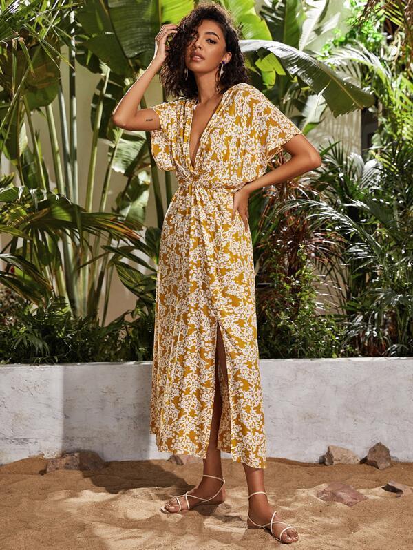 Batwing Sleeve Split Hem Floral Print Dress - $18.00 SGD