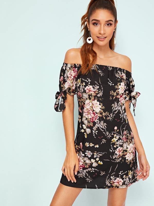 Botanical Print Tie Cuff Off Shoulder Dress