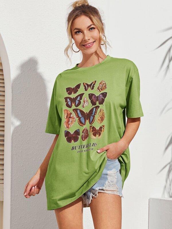 Butterfly And Slogan Graphic Oversized Tee