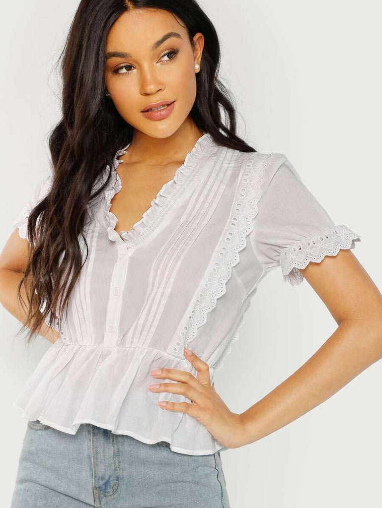 Button Front Ruffle Trim Blouse