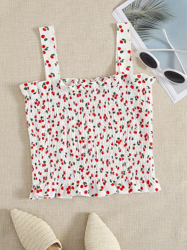 Cherry Print Frill Trim Shirred Top - $25.00 SGD