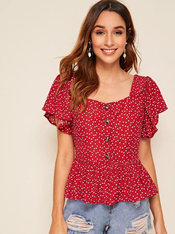 Confetti Heart Print Ruffle Hem Blouse - $32.00 SGD