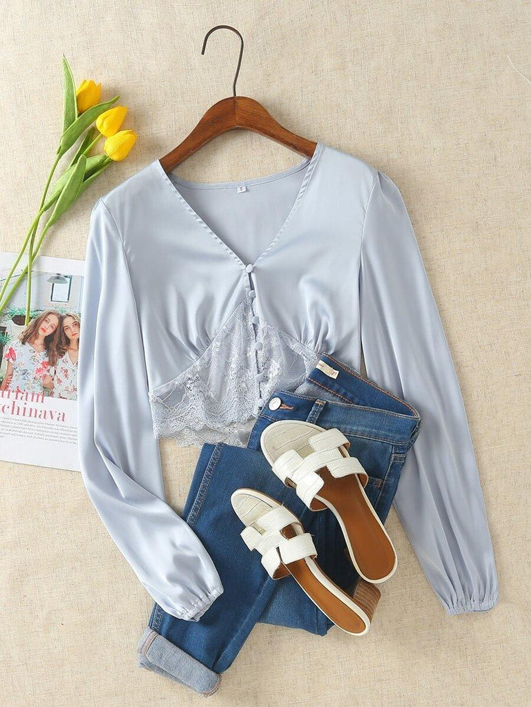 Contrast Lace Button Up Crop Blouse - $35.00 SGD