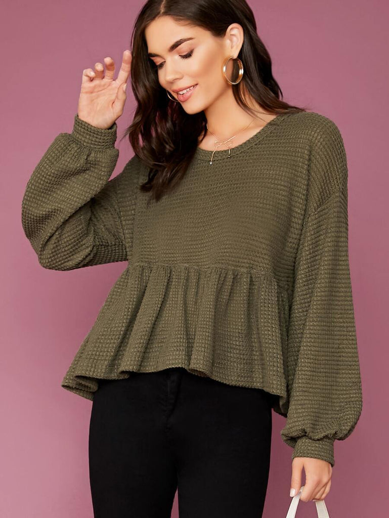 Crew Neck Waffle Knit Peplum Hem Top