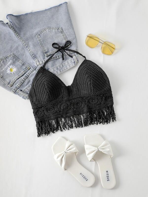 Crochet Fringe Trim Tie Back Halter Top - $27.00 SGD