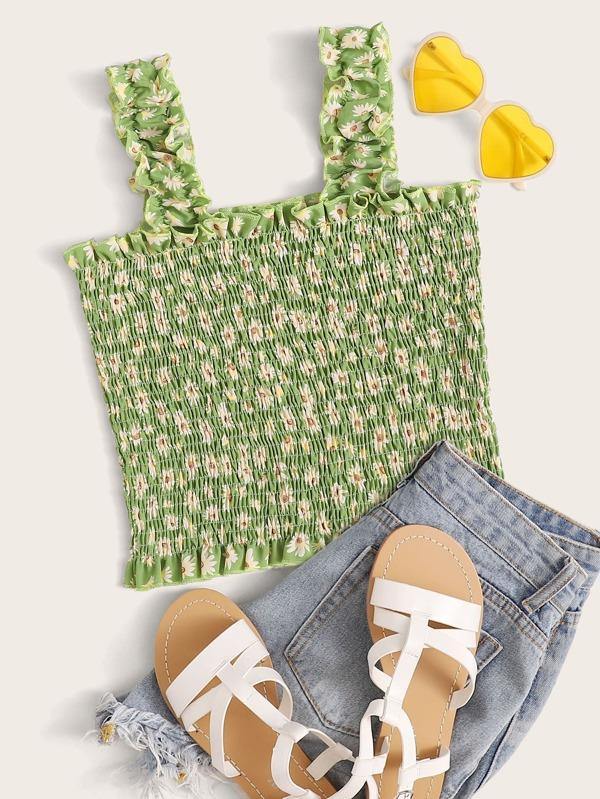 Daisy Floral Frill Trim Shirred Cami Top - $17.00 SGD