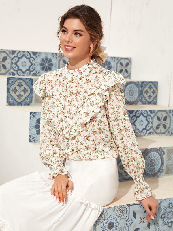 Ditsy Floral Print Ruffle Trim Blouse - $23.00 SGD