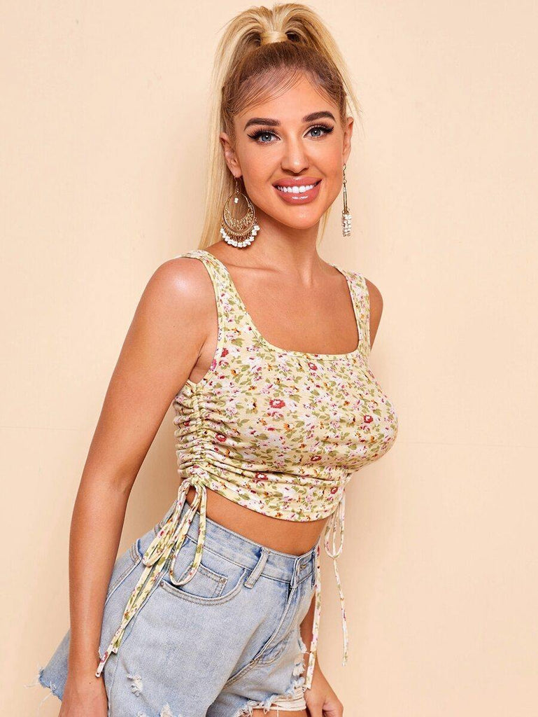 Drawstring Side Allover Floral Print Crop Tank Top - $25.00 SGD