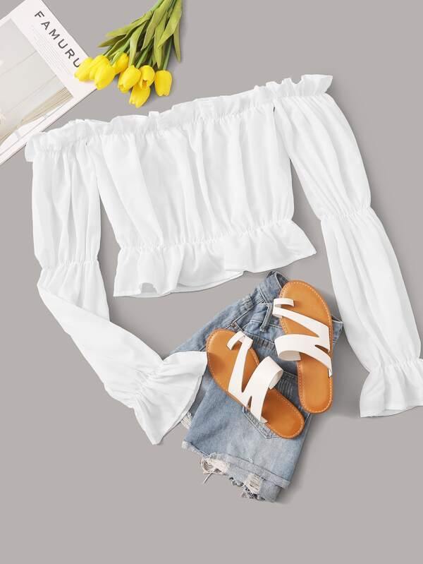 Frill Flounce Sleeve Bardot Blouse - $15.00 SGD