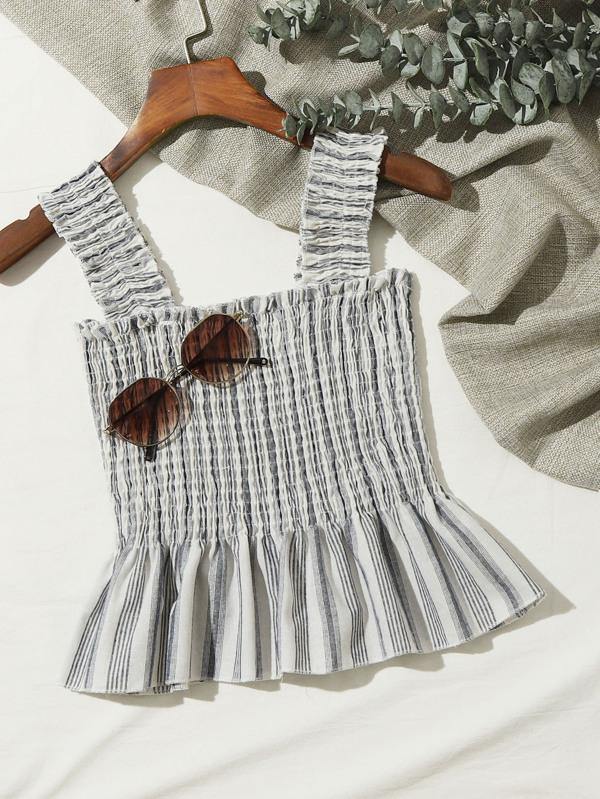 Frill Trim Shirred Striped Peplum Top - $26.00 SGD