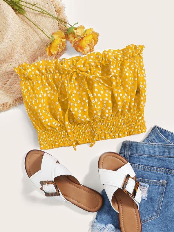 Frilled Tie Front Shirred Hem Ditsy Floral Tube Top