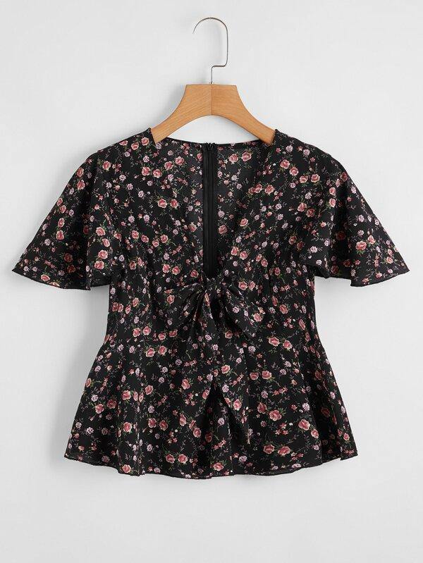 Knot Front Ruffle Hem Ditsy Floral Blouse