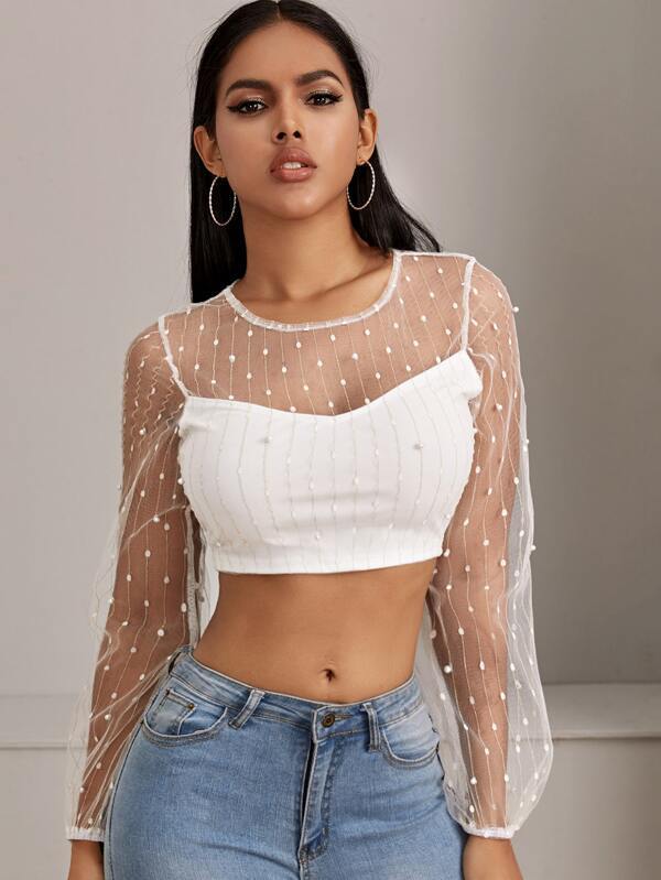 Lantern Sleeve Pearls Beaded Sheer Mesh Crop Top
