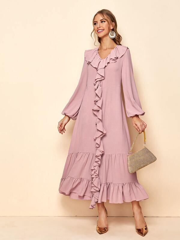 Lantern Sleeve Ruffle Trim Smock Dress - $30.00 SGD