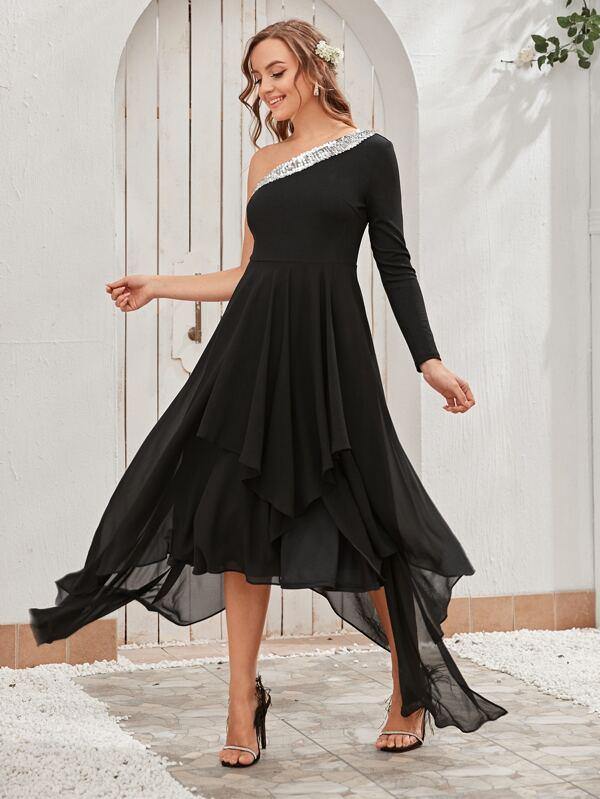 One Shoulder Contrast Sequin Panel Hanky Hem Dress
