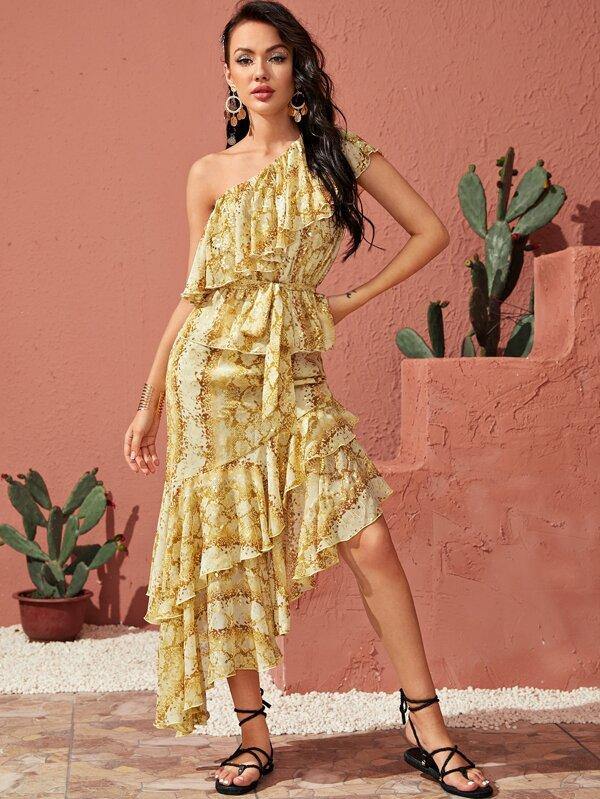One Shoulder Ruffle Trim Belted Snakeskin Peplum Top