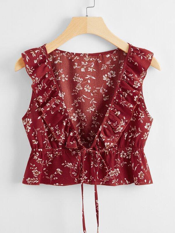 Plunging Neck Ruffle Trim Ditsy Floral Top