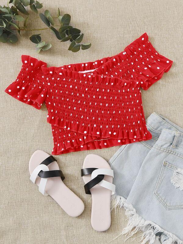 Polka Dot Shirred Detail Frill Trim Crop Top - $19.00 SGD