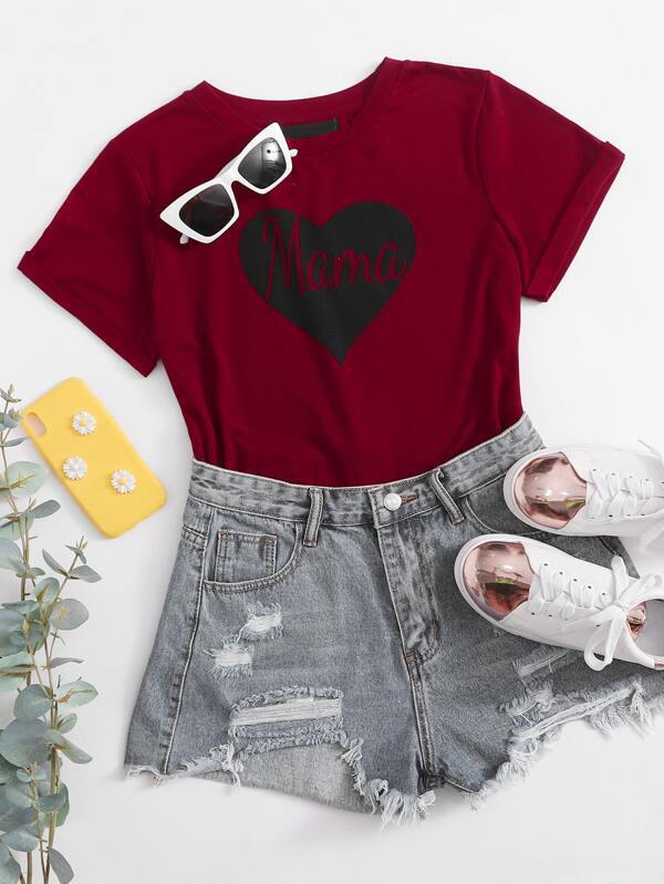 Roll Up Sleeve Heart & Letter Graphic Tee