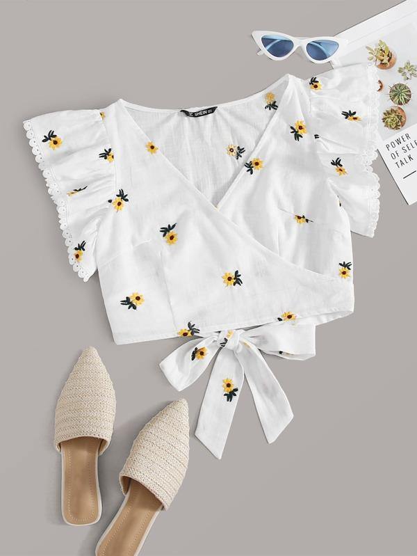 Ruffle Armhole Embroidery Wrap Tie Back Top