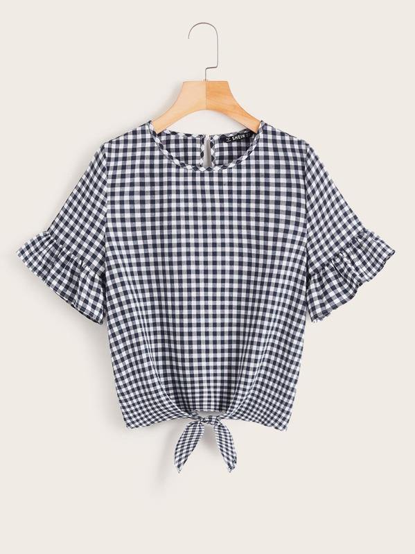 Ruffle Cuff Tie Hem Plaid Top - $28.00 SGD