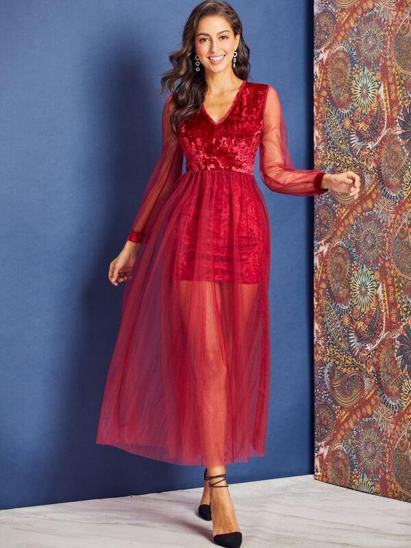 SBetro Velvet Sheer Flowy Mesh Overlay Dress