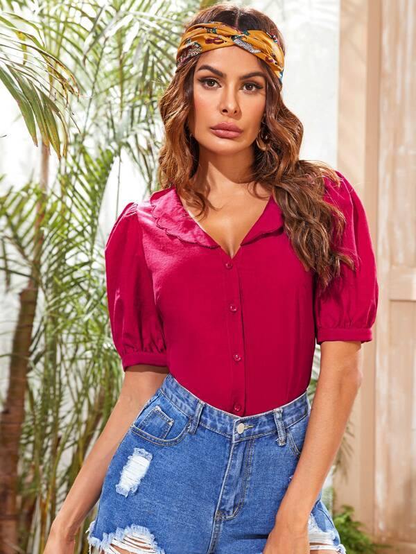 Scallop Edge Collar Puff Sleeve Blouse - $27.00 SGD