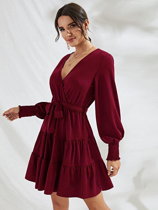 Shirred Bishop Sleeve Layered Ruffle Belt Dress