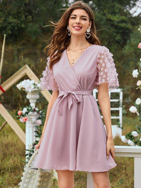 Stereo Flower Contrast Mesh Sleeve Belted Dress