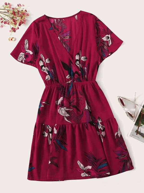 Surplice Floral Print Ruffle Hem Dress