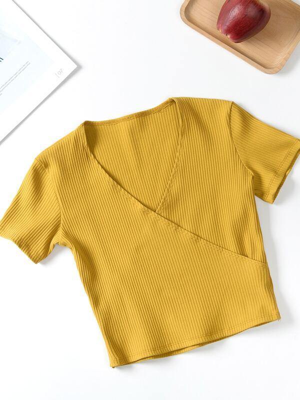 Surplice Front Rib-knit Solid Tee - $34.00 SGD