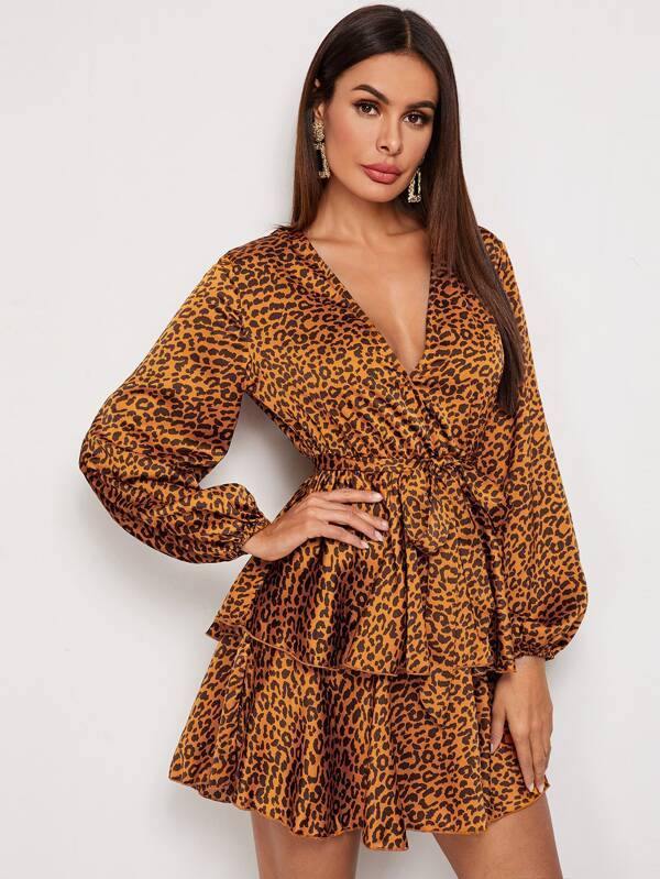 Surplice Neck Balloon Sleeve Layered Leopard Dress