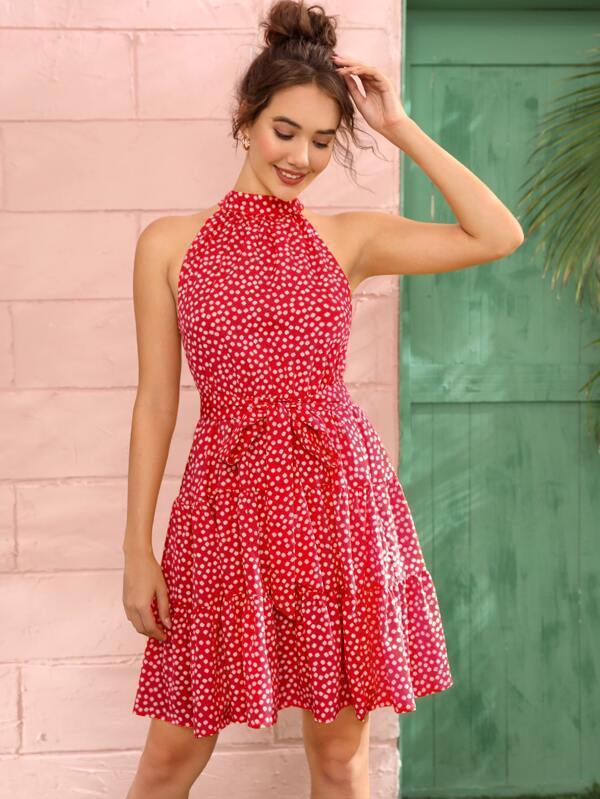 Tie Back Self Belted Ditsy Floral Halter Dress